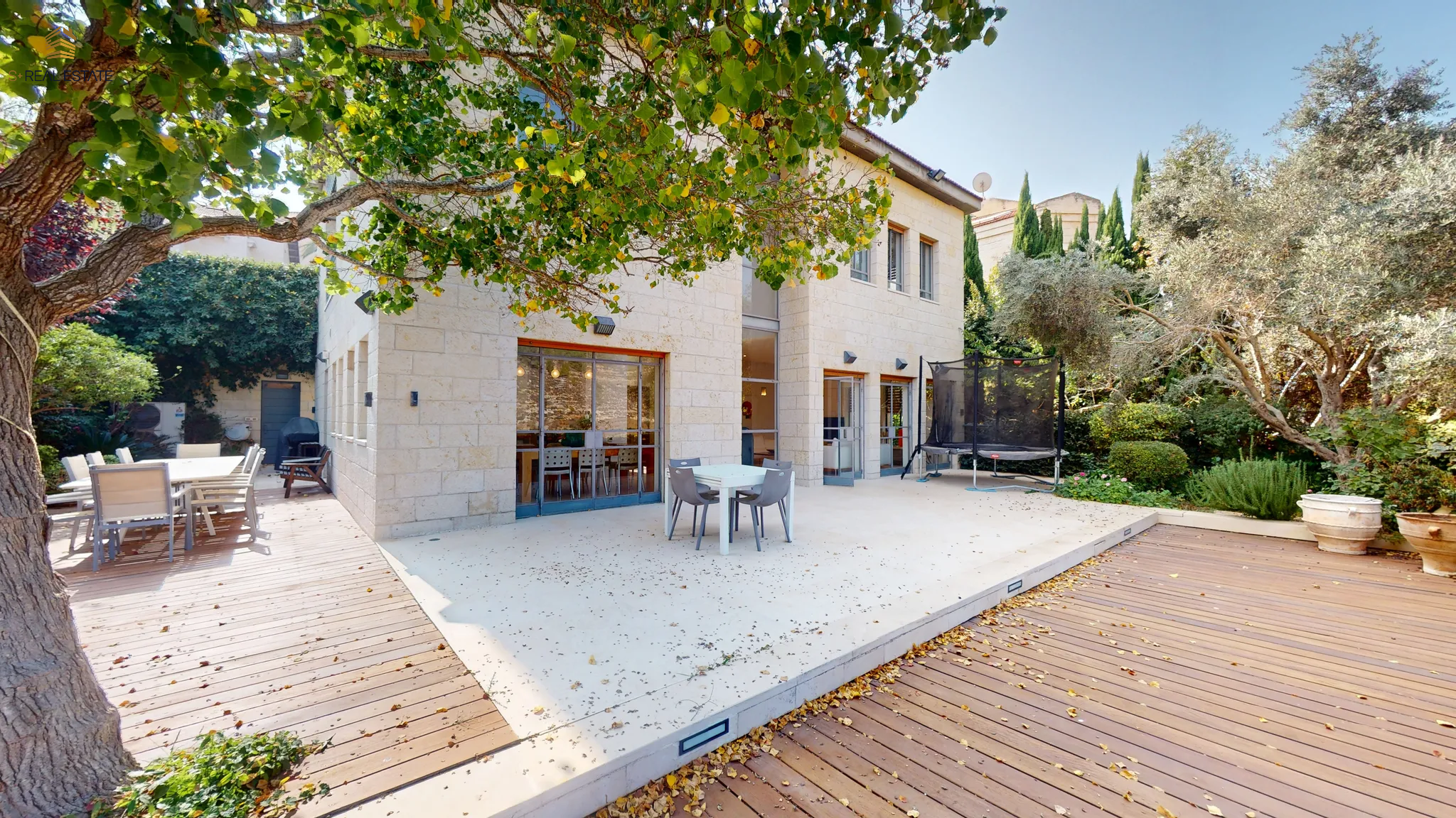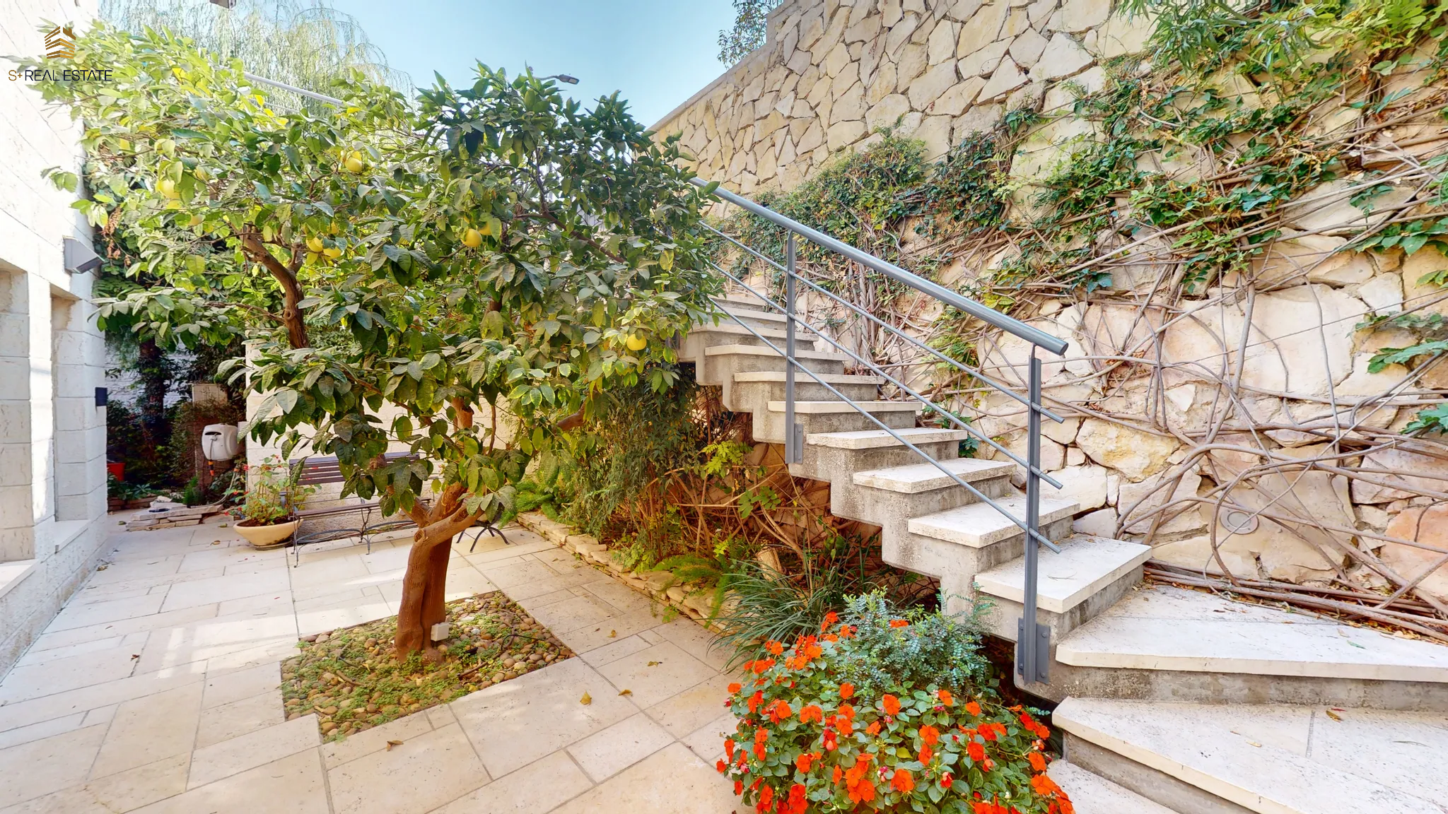 400 מ"ר גינה היקפית מרוצפת באבן טבעית בשילוב עם דק עץ, מילוי אדמה (אפשרות לבניית בריכה ללא חפירות בסלע), עצי פרי, מחסן פרטי.